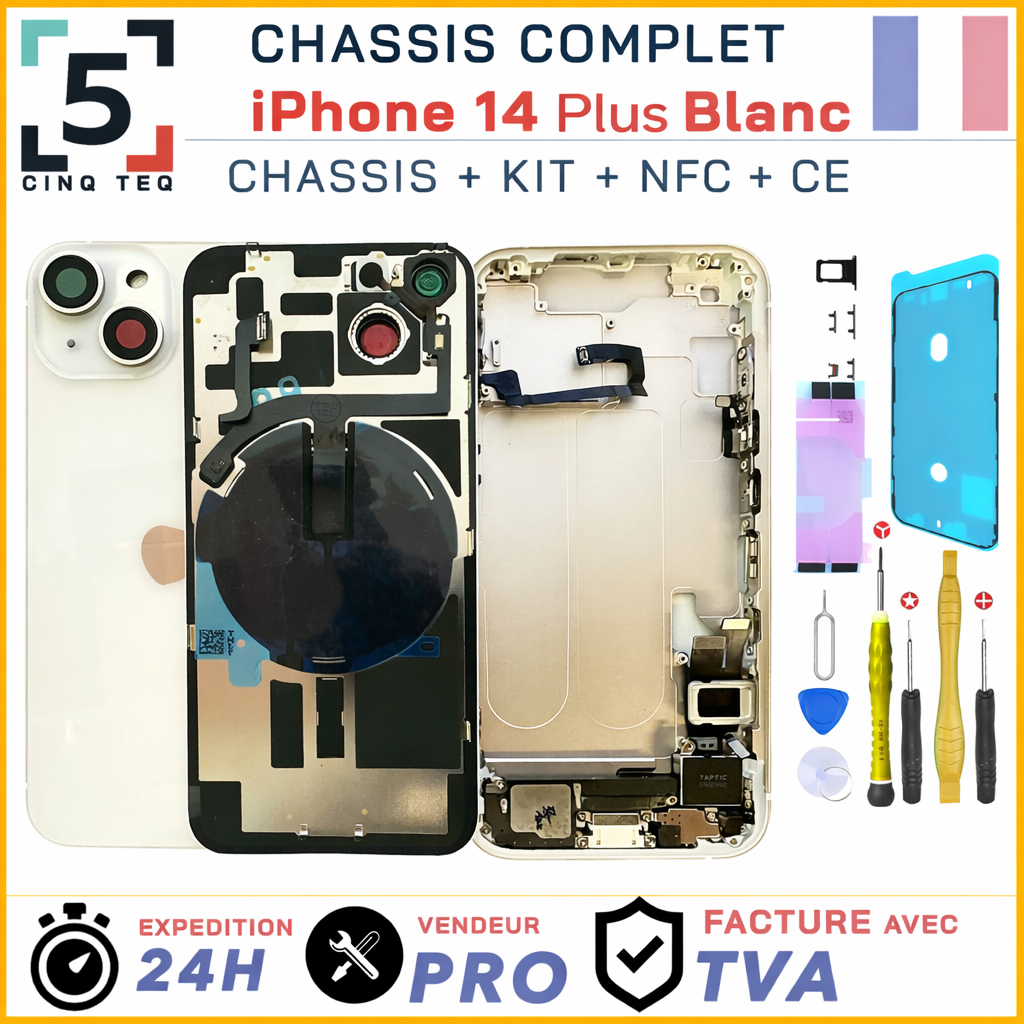 Chassis Complet Remplacement iPhone 14 Plus Blanc Argent Arriere +Cadre NFC +Kit