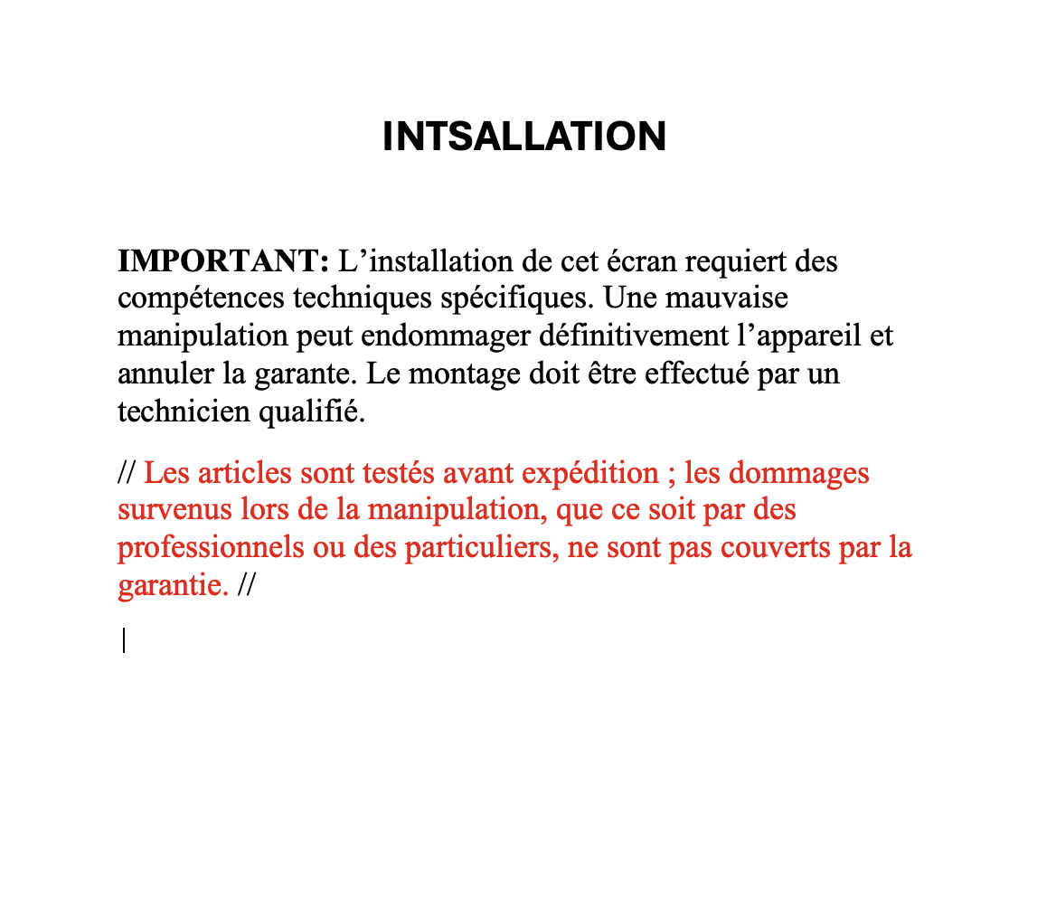 IMPORTANT: L’installation de cet écran requiert des compétences techniques spécifiques.